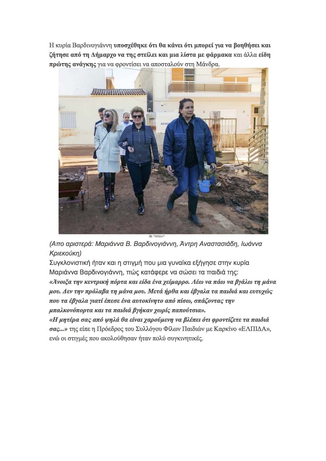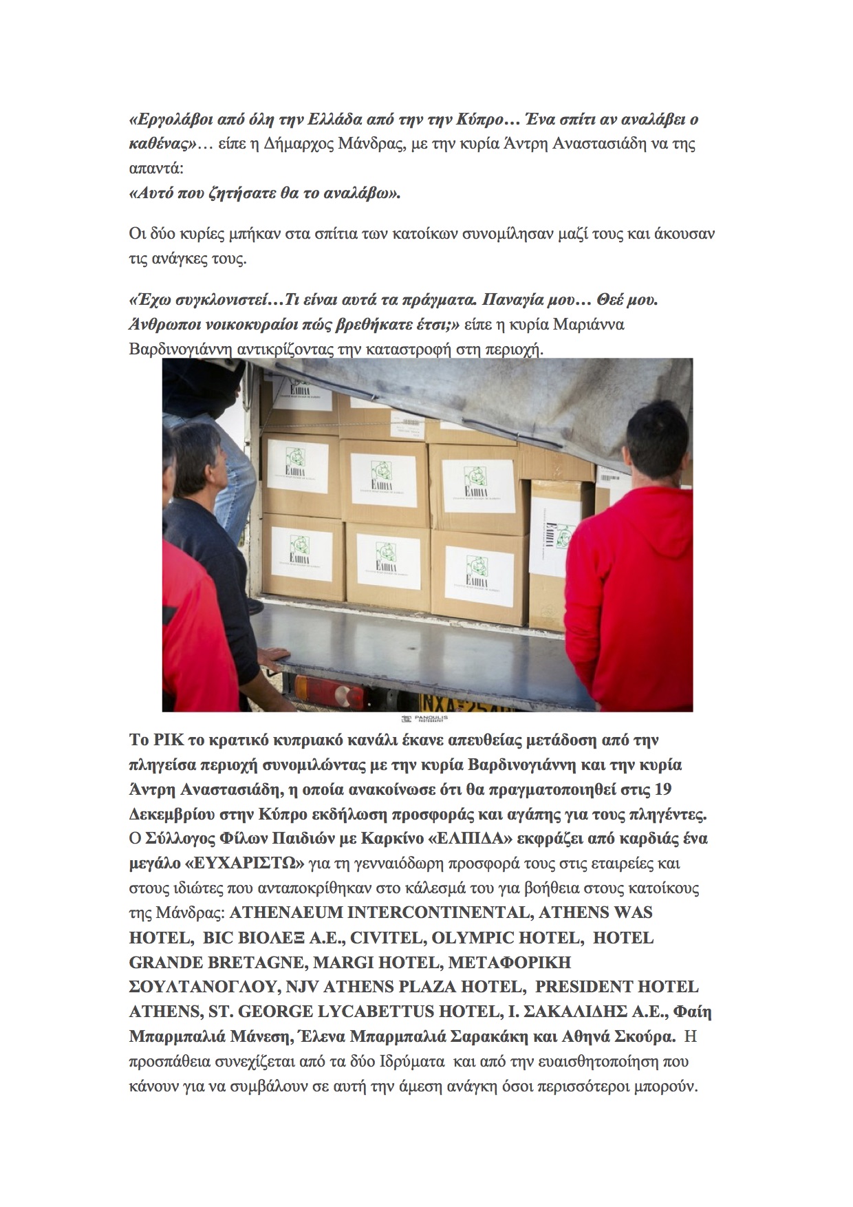 Η «Τέχνη της Ζωής» συνεχίζοντας την συμπαράστασή της στους κατοίκους της Μάνδρας Αττικής που επλήγησαν από τις πρόσφατες πλημμύρες προσέφερε λευκά είδη σε συνεργασία με τον Σύλλογο «Ελπίδα», όπου μέλη του επισκέφτηκαν και την συγκεκριμένη περιοχή.